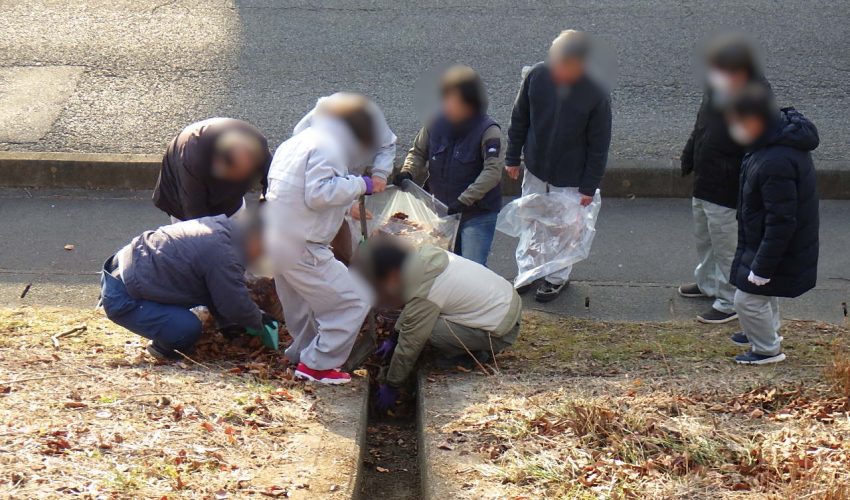 側溝や道路に散乱した枯葉やごみを収集しました。